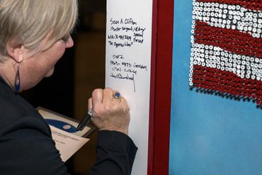 The flag is the first 3-D art creation of U.S. Navy Chief Petty Officer Joe Pisano, a renowned San Diego artist. The piece consists of a waving American flag bordered by a frame panel featuring signatures of veterans and their family members. The flag is comprised of more than 4,300 drywall screws and is an interactive piece for veterans - giving family members an opportunity to remember and honor the military service of their loved ones.